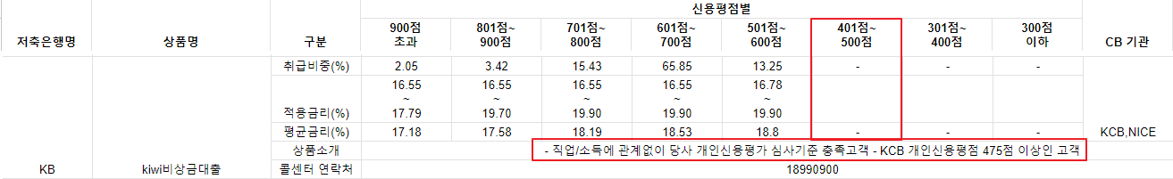 은행에서는 공식적으로 신용평점 기준이 있지만 해당 기준이 된다고 해서 반드시 대출이 나오는 것이 아닙니다. 보시는 것처럼 KB저축은행 비상금대출은 475점이 넘으면 대출이 나온다고 하지만 실제로 500점은 무조건 넘어야 하며 안정적으로 대출을 받기 위해선 600점을 넘어야 하죠.